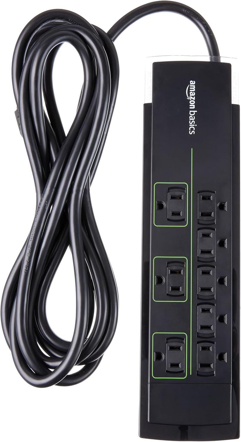 Amazon Basics Rectangular 8-Outlet Power Strip Surge Protector, 4,500 Joule – 12-Foot Cord, Black/Green